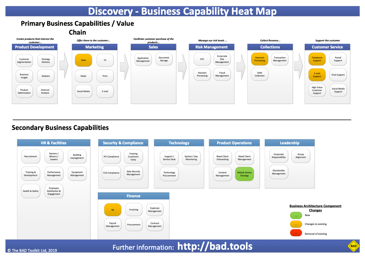 In this stage we use a business capability model for the organisation and again overlay it with the areas that will need to be; created, changed or depricated in order to deliver the concept.