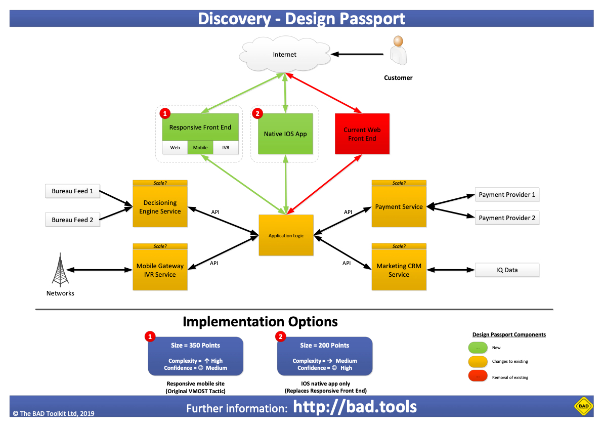 Different technical solutions can be represented, along with a more refined ROM estimate – as shown here were we can either build a responsive front end solution or a native IOS app.