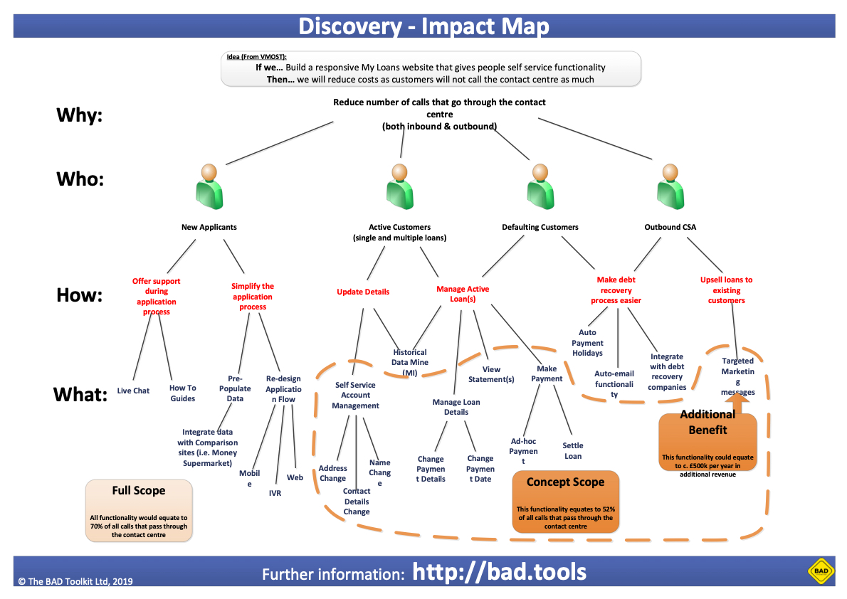 Impact mapping is rapid and it takes a team a mater of hours to agree on the key features in scope for the concept.