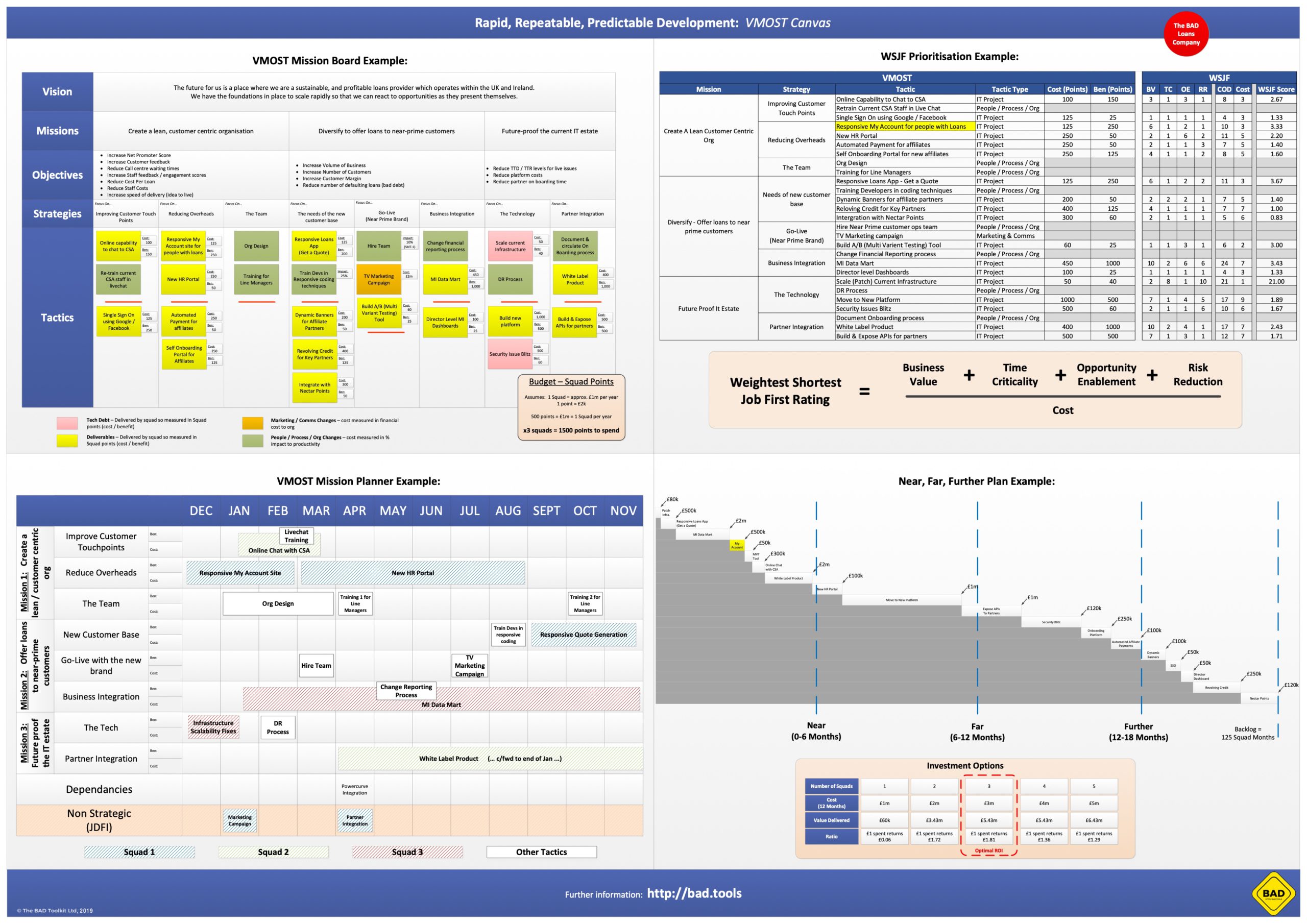 After assessing each idea (Tactic) against business value, urgency and risk, we used WSJF, or Weighted Shortest Job First, to create a prioritised list of all initiatives for the development teams. This list was stack ranked and overlaid on a time line to project what would be delivered within 6, 12 and 18 months.